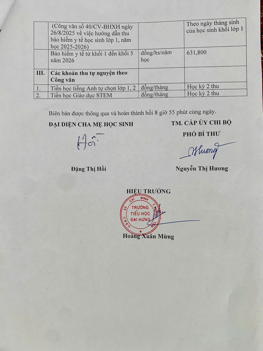 Danh mục thu các khoản dịch vụ phục vụ, hỗ trợ hoạt động giáo dục thực hiện trong Trường Tiểu học Đại Hưng năm học 2025-2026