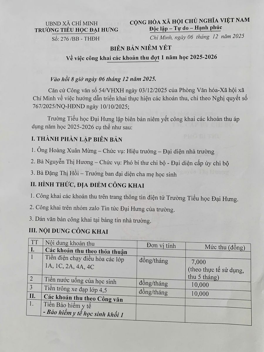 Các khoản thu chi đợt 1 của trường Tiểu học Đại Hưng